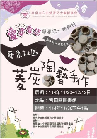 臺南市官田愛菱兒少關懷協會在本市官田區圖書館舉辦「2025愛菱愛你感恩你一起同行.藝象社區.菱炭陶藝手作成果展」,歡迎大家一起參觀。