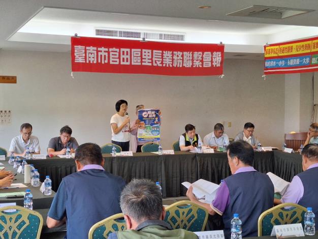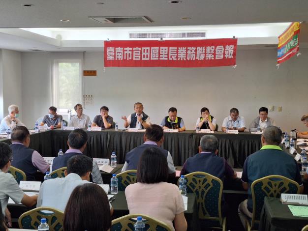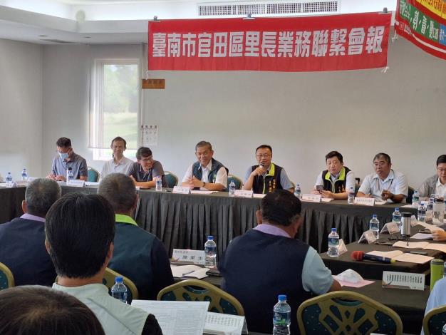 官田區公所今(23)日召開「114年下半年度里長業務聯繫會報」,由區長洪聰發主持,臺南市政府參議林東征、民政局生命事業科科長陳龍政及各局處代表出席,藉由會報與里長進行業務溝通,並就里長所提建議案於會中交流討論。