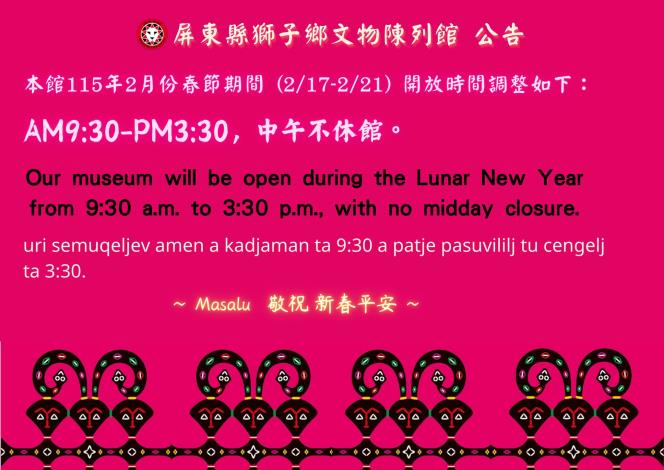 特展展期至115年3月31日止,為使更多民眾於春節連 假期間能就近參觀、深入認識原住民族文化內涵,本所於 春節期間(115年2月17日至2月21日,農曆初一至初五)開 館,開館時間為每日上午9時30分至下午3時30分,