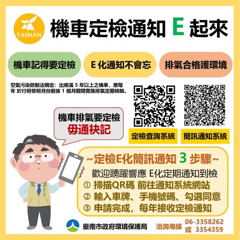 為響應環保無紙化,臺南市自115年起機車定檢不再寄發紙本明信片通知,並改以手機簡訊E化通知,凡車籍設於本市民眾可至「臺南市環境保護局機車定期檢驗簡訊通知系統(https://reurl.cc/9OYK68)」登記手機號碼及車牌,環保局會在應定檢時間寄發簡訊通知,歡迎多加利用。