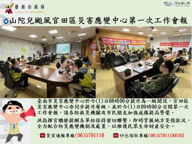 山陀兒颱風本市災害應變中心於10月01日(二)08時00分提升為一級開設,本區亦同步提升區災害應變中心為一級開設,,並於10月1日9時整召開第一次工作會報。提醒各位市民颱風期間儘量避免外出,以維自身安全,位於本區水災潛勢警戒區民眾務必隨時注意政府發布之相關疏散撤離訊息。官田區災害應變中心敬上5791118