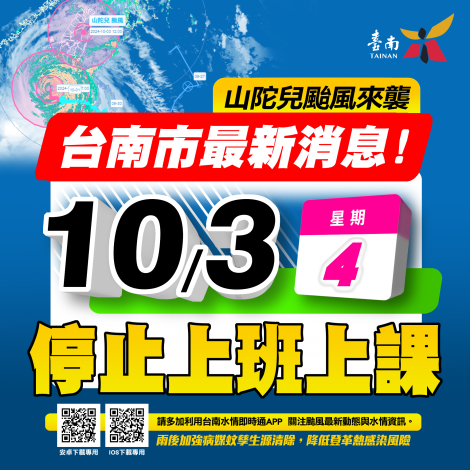 山陀兒颱風警報,明 (3) 日 (週四)臺南市最大陣風達 12 至 13 級;雨量達 400 毫米,已達停班停課標準,為維護市民安全及準備各項應變作為,臺南市政府 10/2 日晚上 6 點宣布,明 (10/3)日停止上班、停止上課。