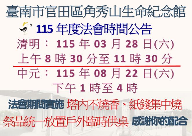 清明:115年03月28日(六)上午8時30分至11時30分 中元:115年08月22日(六)下午1時至4時 法會期間實施: 塔內不燒香、紙錢集中燒 祭品統一放置戶外臨時供桌